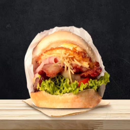 Pão, coração, quejio, bacon, cheddar, ovo, molho billy jack, alface e tomate.