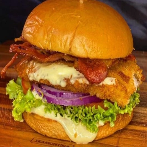 Pão, frango empanado, queijo, bacon, ovo, cheddar, molho bili jack, alface, tomate e batata palha.